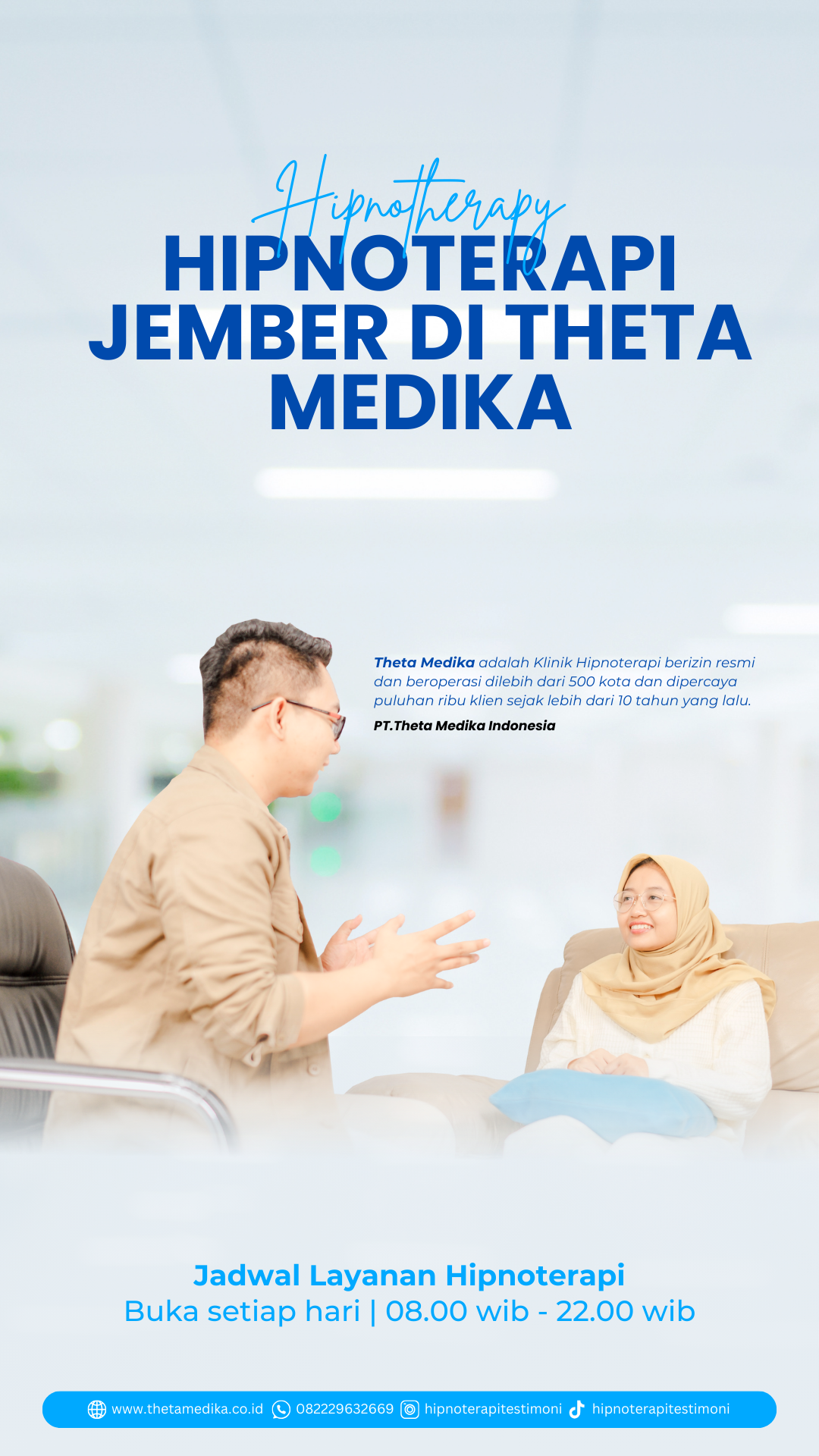 Theta Medika terus memberikan kontribusi untuk memberikan dampak baik psikis masyarakat melalui layanan Hipnoterapi, dan kini memiliki cabang di seluruh kota di Indonesia salah satunya layanan Hipnoterapi di Jember Timur sudah bisa di gunakan.