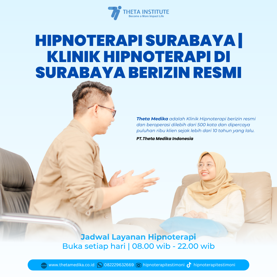 Hipnoterapi Surabaya | Klinik Hipnoterapi di Surabaya berizin resmi Bagi Anda yang mencari layanan hipnoterapi profesional di Surabaya, pastikan memilih klinik yang telah memiliki izin resmi dan terdaftar di lembaga terkait. Salah satu klinik hipnoterapi terpercaya di Surabaya adalah Theta Medika Surabaya. Klinik ini menawarkan layanan hipnoterapi berbasis ilmu psikologi dan terapi berbasis sugesti yang telah terbukti efektif.