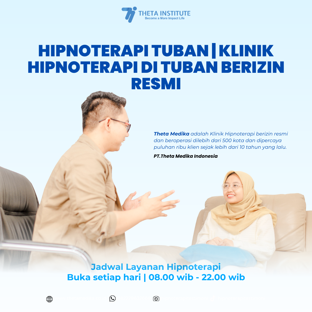 Hipnoterapi Tuban | Klinik Hipnoterapi di Tuban berizin resmi Theta Medika adalah jaringan klinik hipnoterapi profesional yang telah beroperasi di lebih dari 50 kota di Indonesia, termasuk Tuban. Klinik ini memiliki izin resmi dari Dinas Kesehatan dan didirikan oleh Mastersul (Sulistyo Wasono), seorang hipnoterapis klinis berpengalaman lebih dari 10 tahun. Theta Medika menawarkan layanan hipnoterapi untuk berbagai masalah seperti trauma, fobia, kecemasan, insomnia, dan peningkatan kepercayaan diri. Klinik ini juga menyediakan konsultasi gratis dan layanan terapi baik secara langsung maupun online.
