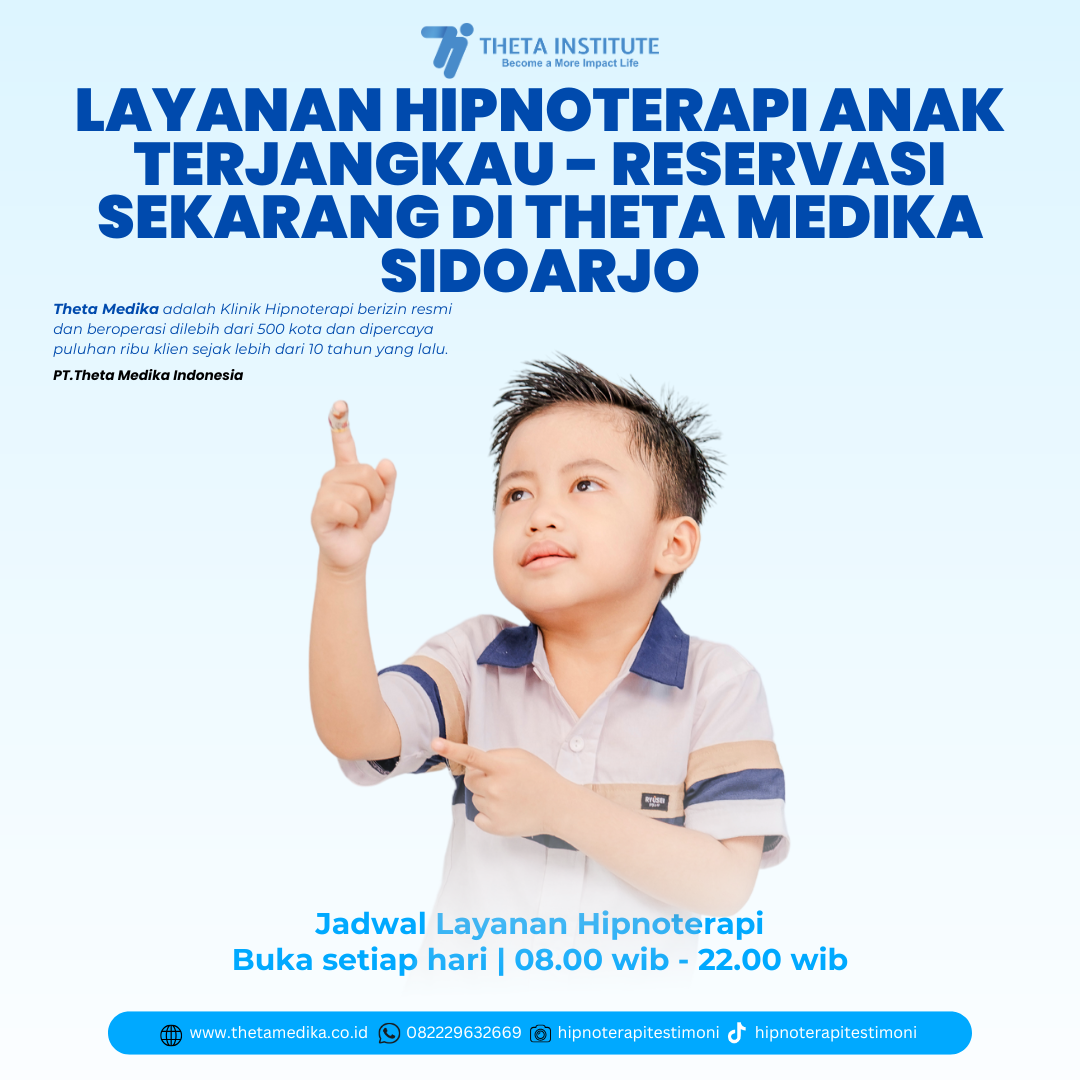 - Hipnoterapi merupakan solusi yang efektif dan aman untuk membantu anak mengatasi berbagai permasalahan psikologis dan perilaku. Theta Medika Hipnoterapi Sidoarjo siap menjadi mitra bagi orang tua dalam membantu anak mereka berkembang dengan lebih baik. Jika Anda memiliki anak yang menghadapi masalah seperti kecemasan, kurang percaya diri, atau kebiasaan buruk, segera konsultasikan ke Theta Medika untuk mendapatkan solusi terbaik.
