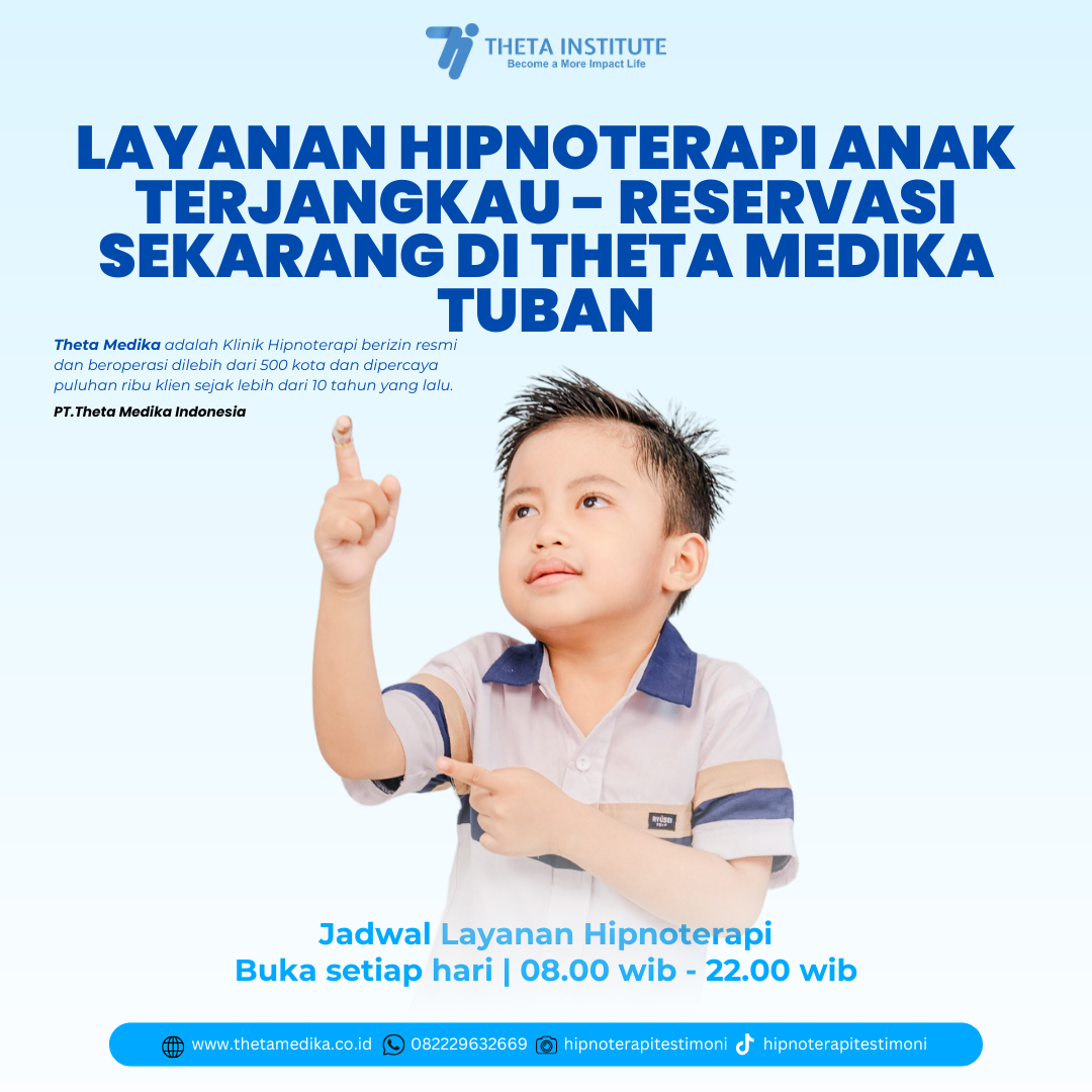 Layanan Hipnoterapi Anak terjangkau – Reservasi Sekarang Theta Medika Tuban Apakah Anda sedang menghadapi tantangan dalam mendampingi anak yang mengalami kesulitan emosional, perilaku, atau kebiasaan buruk yang sulit diubah? Atau mungkin Anda merasa khawatir melihat anak menjadi semakin tertutup, sering tantrum, sulit fokus saat belajar, atau bahkan mulai kecanduan gadget? Jangan khawatir, Anda tidak sendiri. Banyak orang tua mengalami kebingungan dalam mencari solusi terbaik untuk membantu anak berkembang secara optimal, baik secara mental maupun emosional. Di sinilah hipnoterapi anak hadir sebagai alternatif yang efektif dan aman. Theta Medika Tuban menyediakan layanan hipnoterapi anak yang tidak hanya profesional, tetapi juga terjangkau, sehingga dapat diakses oleh lebih banyak keluarga yang membutuhkan bantuan ahli dalam mengatasi berbagai permasalahan anak secara menyeluruh.