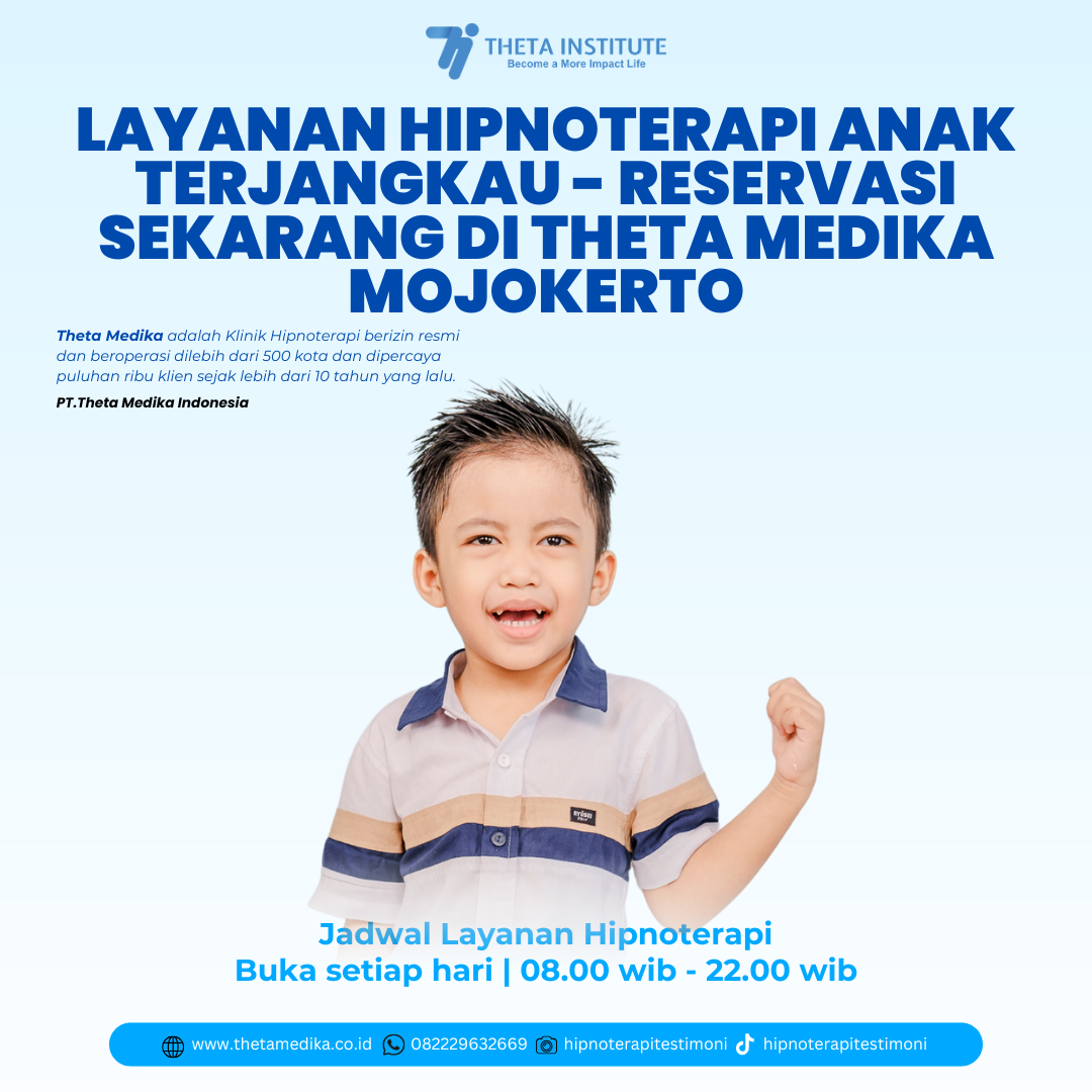 - Hipnoterapi merupakan solusi yang efektif dan aman untuk membantu anak mengatasi berbagai permasalahan psikologis dan perilaku. Theta Medika Hipnoterapi Mojokerto siap menjadi mitra bagi orang tua dalam membantu anak mereka berkembang dengan lebih baik. Jika Anda memiliki anak yang menghadapi masalah seperti kecemasan, kurang percaya diri, atau kebiasaan buruk, segera konsultasikan ke Theta Medika untuk mendapatkan solusi terbaik.