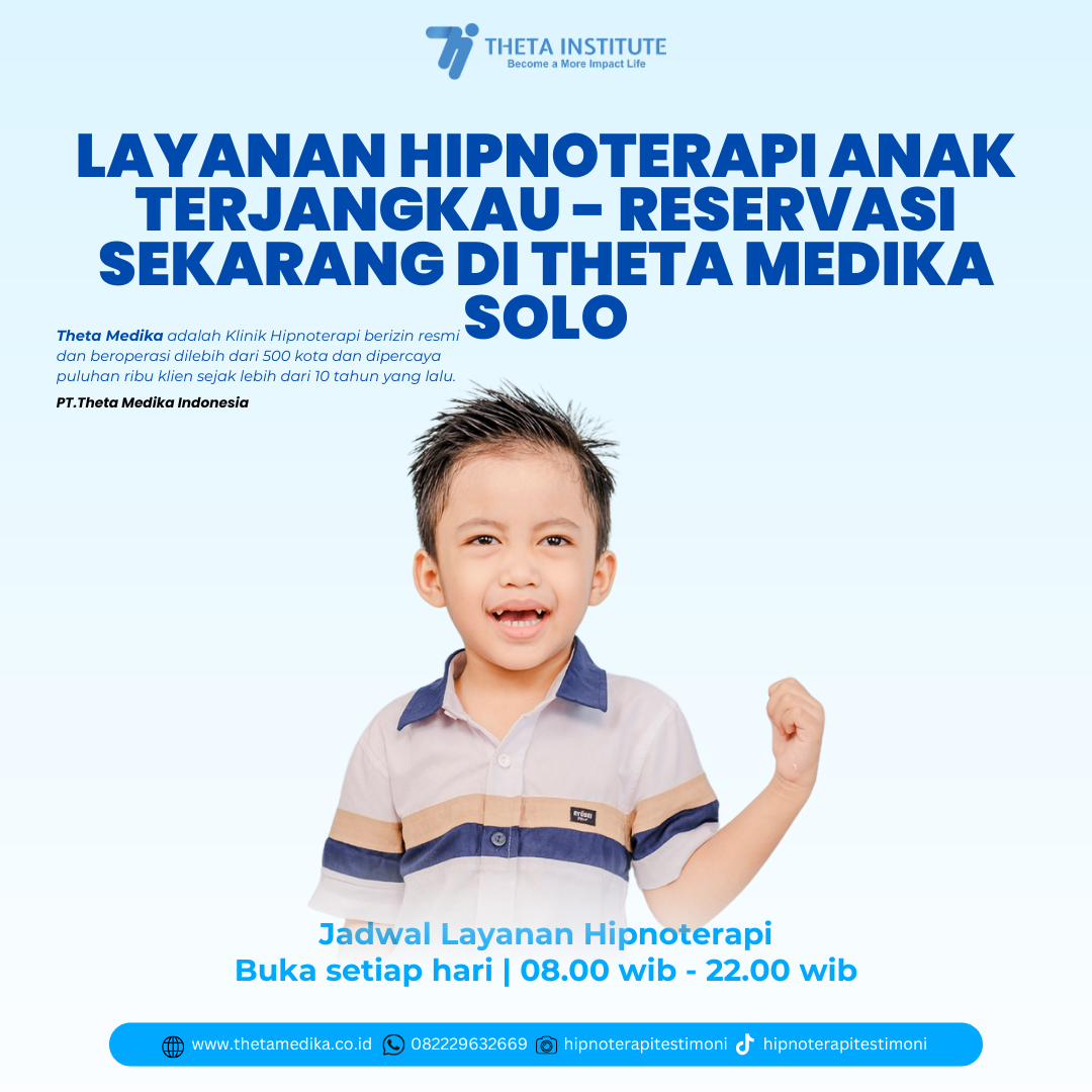 - Hipnoterapi merupakan solusi yang efektif dan aman untuk membantu anak mengatasi berbagai permasalahan psikologis dan perilaku. Theta Medika Hipnoterapi Solo siap menjadi mitra bagi orang tua dalam membantu anak mereka berkembang dengan lebih baik. Jika Anda memiliki anak yang menghadapi masalah seperti kecemasan, kurang percaya diri, atau kebiasaan buruk, segera konsultasikan ke Theta Medika untuk mendapatkan solusi terbaik.