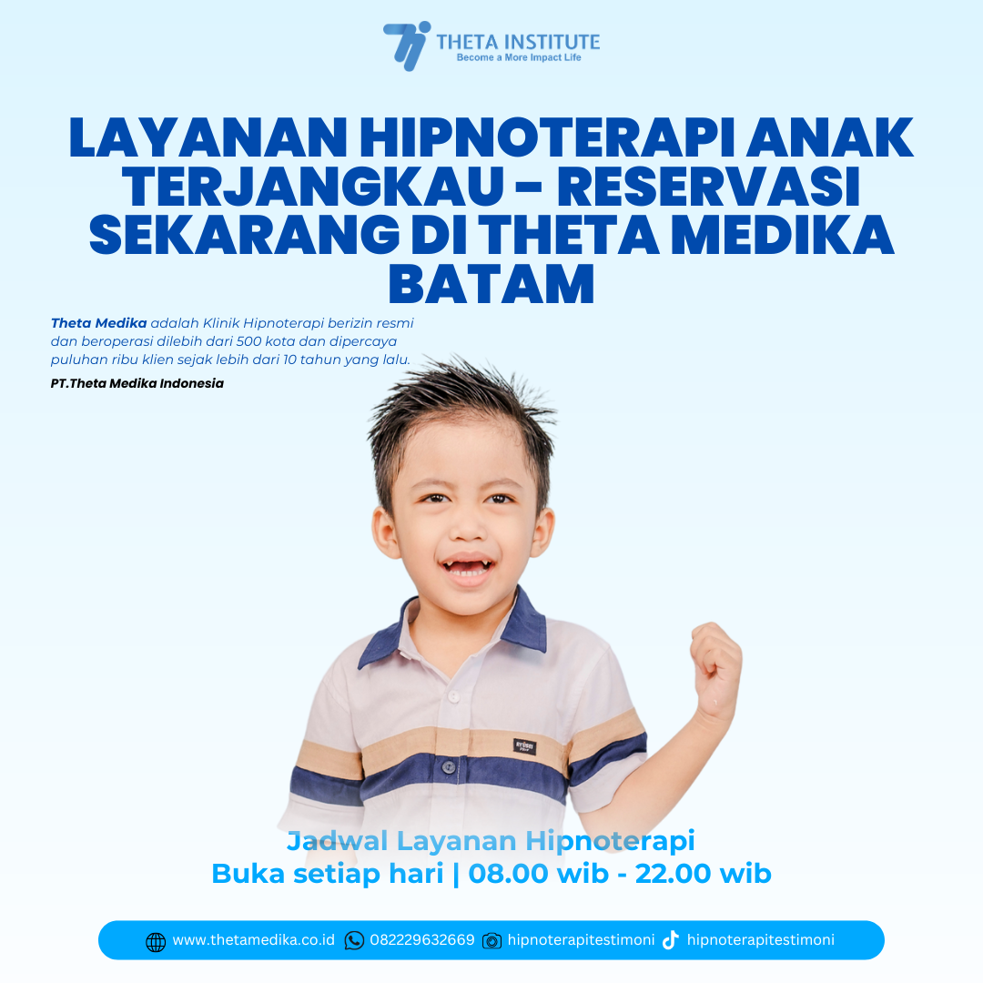 - Hipnoterapi merupakan solusi yang efektif dan aman untuk membantu anak mengatasi berbagai permasalahan psikologis dan perilaku. Theta Medika Hipnoterapi Batam siap menjadi mitra bagi orang tua dalam membantu anak mereka berkembang dengan lebih baik. Jika Anda memiliki anak yang menghadapi masalah seperti kecemasan, kurang percaya diri, atau kebiasaan buruk, segera konsultasikan ke Theta Medika untuk mendapatkan solusi terbaik.
