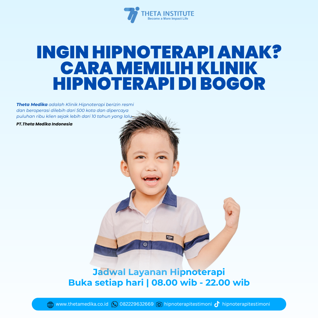 - Hipnoterapi merupakan solusi yang efektif dan aman untuk membantu anak mengatasi berbagai permasalahan psikologis dan perilaku. Theta Medika Hipnoterapi Bogor siap menjadi mitra bagi orang tua dalam membantu anak mereka berkembang dengan lebih baik. Jika Anda memiliki anak yang menghadapi masalah seperti kecemasan, kurang percaya diri, atau kebiasaan buruk, segera konsultasikan ke Theta Medika untuk mendapatkan solusi terbaik.