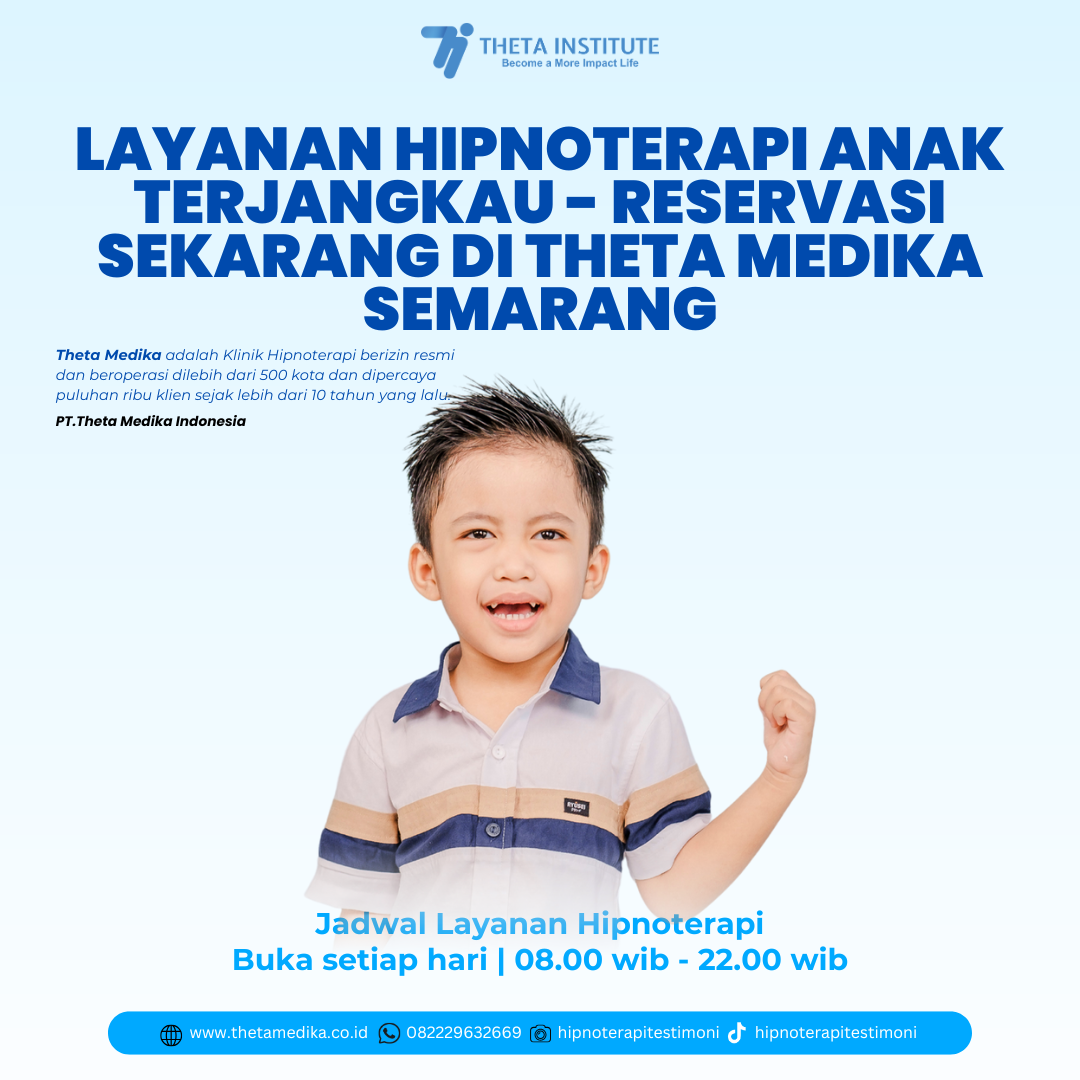 Layanan Hipnoterapi Anak terjangkau – Reservasi Sekarang Theta Medika Semarang – Sebagai orang tua, melihat anak menghadapi tantangan emosional atau perilaku bisa menjadi pengalaman yang membingungkan dan melelahkan. Apakah anak Anda sering merasa cemas, sulit berkonsentrasi, mengalami kesulitan tidur, atau menunjukkan perubahan sikap yang tidak biasa? Masalah seperti ini tidak boleh diabaikan, karena jika dibiarkan berlarut-larut dapat memengaruhi perkembangan mental dan sosial anak di masa depan. Di sinilah hipnoterapi anak hadir sebagai solusi yang aman dan efektif. Theta Medika Semarang menawarkan layanan hipnoterapi anak dengan pendekatan profesional, menyenangkan, dan tentunya terjangkau bagi semua kalangan. Kami memahami bahwa setiap anak memiliki cara unik dalam mengekspresikan diri dan menghadapi tekanan, oleh karena itu kami hadir untuk mendampingi proses penyembuhan dan tumbuh kembang mereka dengan metode yang tepat dan penuh empati.Layanan Hipnoterapi Anak Terjangkau – Reservasi Sekarang Di Theta Medika Semarang – Theta Medika Semarang dikenal sebagai klinik hipnoterapi profesional dengan tenaga terapis bersertifikat dan berpengalaman dalam menangani anak-anak. Kami memahami bahwa setiap anak itu unik, oleh karena itu pendekatan yang kami gunakan disesuaikan dengan karakter dan kebutuhan masing-masing anak. Proses Hipnoterapi untuk Anak Sesi hipnoterapi di Theta Medika Semarang dimulai dengan konsultasi awal bersama orang tua untuk memahami masalah yang dialami anak. Setelah itu, terapis akan menggunakan teknik hipnosis yang sesuai dengan kebutuhan anak, seperti relaksasi, visualisasi, dan sugesti positif. Proses ini dilakukan dengan cara yang menyenangkan dan tidak menakutkan bagi anak.