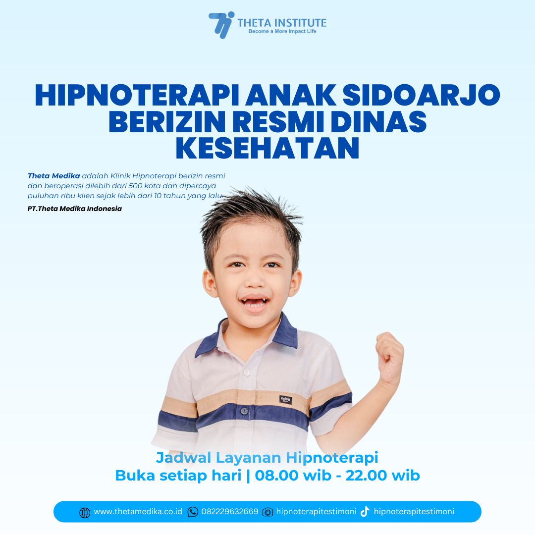 - Hipnoterapi merupakan solusi yang efektif dan aman untuk membantu anak mengatasi berbagai permasalahan psikologis dan perilaku. Theta Medika Hipnoterapi Sidoarjo siap menjadi mitra bagi orang tua dalam membantu anak mereka berkembang dengan lebih baik. Jika Anda memiliki anak yang menghadapi masalah seperti kecemasan, kurang percaya diri, atau kebiasaan buruk, segera konsultasikan ke Theta Medika untuk mendapatkan solusi terbaik.
