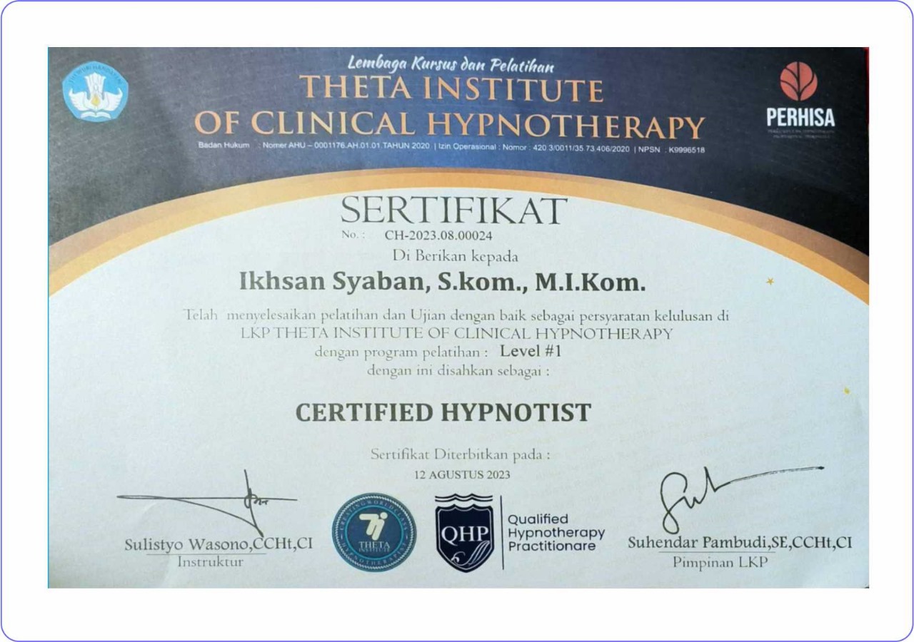 Peserta akan mendapatkan sertifikat resmi dengan gelar non formal CH (Certified Hypnotist). Bisa dicantumkan dibelakang nama. terdaftar di dapodik kemendikbudristek